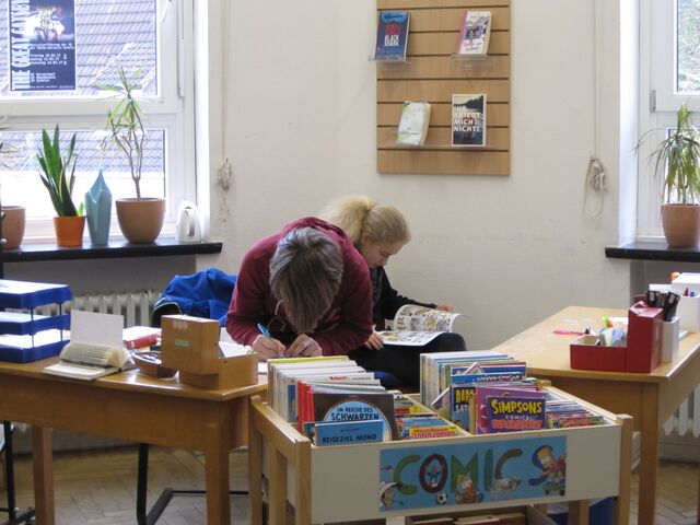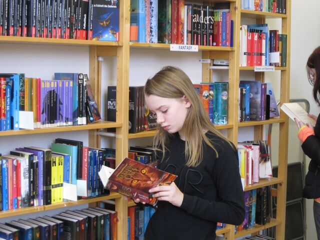 Bei uns könnt ihr in der ersten großen Pause lesen, stöbern und Bücher ausleihen. Wir haben im ersten Stock eine gemütliche Bücherei mit Leseplätzen, wo Ihr Bücher, aber auch Zeitschriften (zur Zeit haben wir die Popcorn und Dein Spiegel im Abonnement) oder Comics (zum Beispiel Lucky Luke, Asterix oder Die Simpsons oder oder oder) lesen könnt. Natürlich könnt Ihr alle Bücher auch ausleihen, nämlich für drei Wochen. Die Leihfrist ist selbstverständlich verlängerbar.