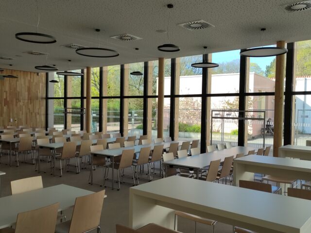 Seit August 2022 haben wir eine neue Mensa, die auch als Multifunktionsraum für Leher:innenkonfernezen oder Treffen des SEB genutzt werden kann.