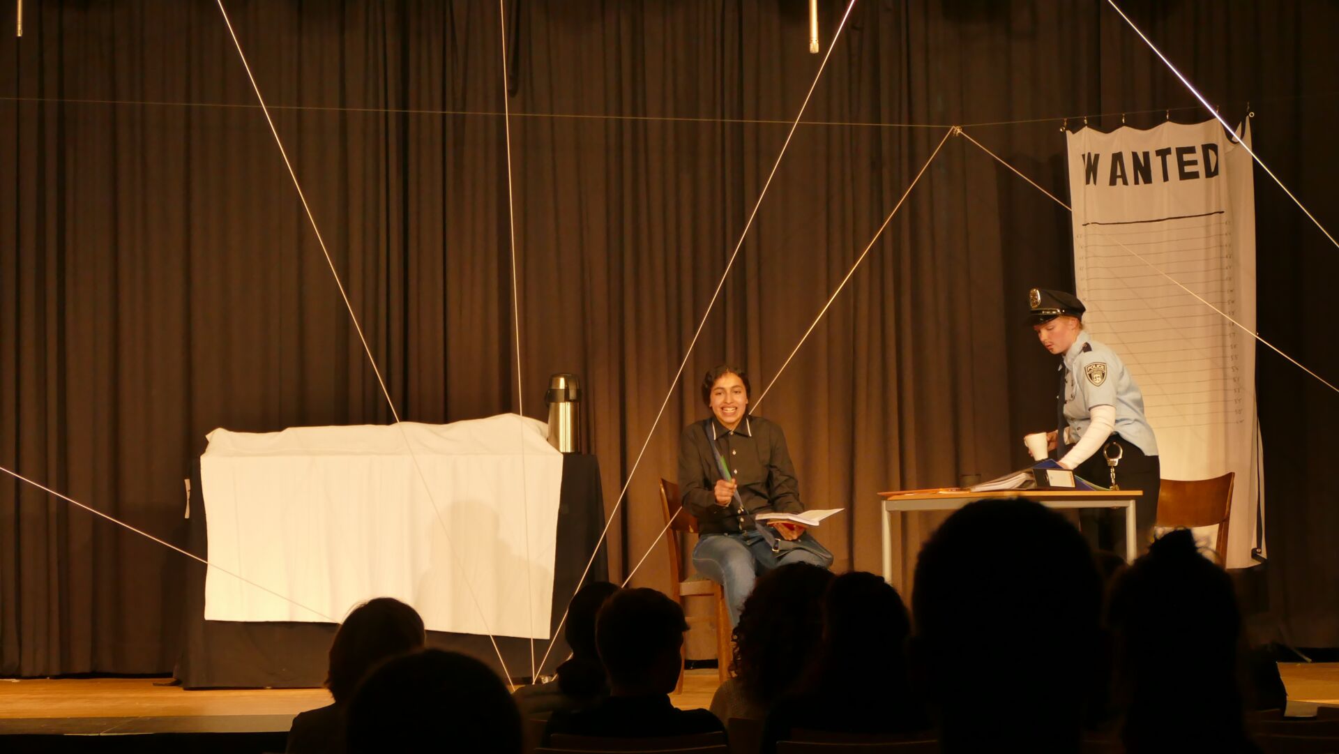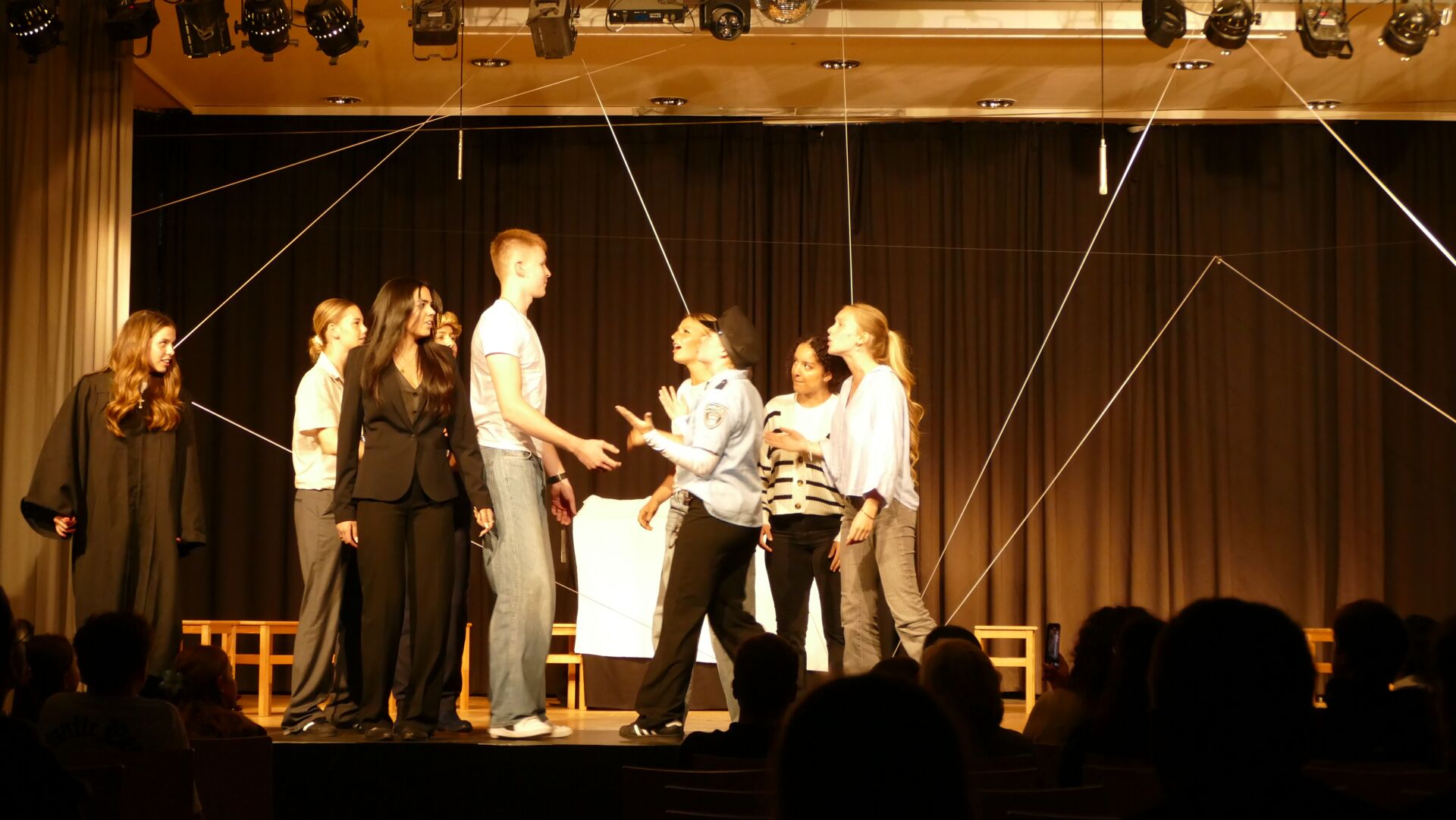 Der Kurs hat eine beeindruckende Inszenierung auf die Bühne gebracht. Die Schuldverstrickungen wurden ein über die gesamte Bühne gespanntes und verkreuztes Gummiband dargestellt und die Getötete war auf einer stilisierten, rollenden Leichenbahre permanent präsent.