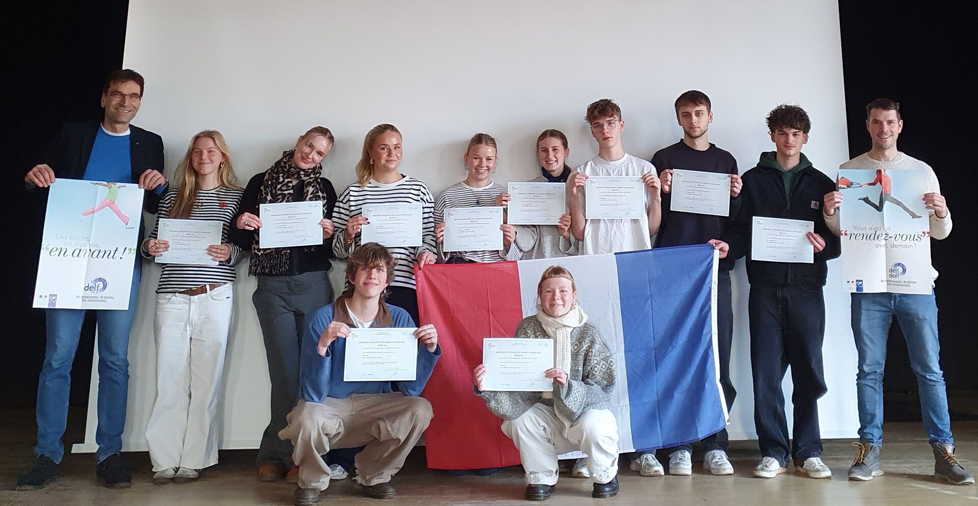 Nachdem 14 Schülerinnen und Schüler des aktuellen Q1-Jahrgangs bereits im letzten Schuljahr alle zum Erwerb des DELF-Zertifikats auf Niveau B1 (gemäß dem Gemeinsamen Europäischen Referenzrahmen für Sprachen) zu bestehenden Teilbereiche (Hörverstehen, Leseverstehen, Textproduktion und mündliche Prüfung) erfolgreich absolviert hatten, konnten sie heute endlich die jüngst frisch aus Frankreich eingetroffenen Zertifikate persönlich entgegennehmen. Diese sind lebenslang gültig und bereichern jeden Lebenslauf.