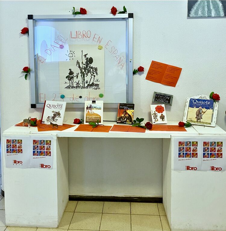 En España, sin embargo, es muy conocido y asociado a muchas tradiciones. Para nuestro proyecto nos fijamos en primer lugar en cómo se celebra el Día del Libro en España y en Cataluña: Con muchas rosas, según la leyenda de San Jordi que mató al dragón, y, naturalmente, con libros. Fue en este día que murió Miguel Cervantes, uno de los autores españoles más famosos. Es posible que haya oído hablar del libro Don Quijote. Este es probablemente su libro más conocido y uno de los más vendidos en el mundo. Por eso buscamos en Cervantes y sus libros y dimos con el Instituto Cervantes. Tiene muchos sitios diferentes en todo el mundo y los interesados pueden aprender más sobre el idioma y la cultura española aquí.