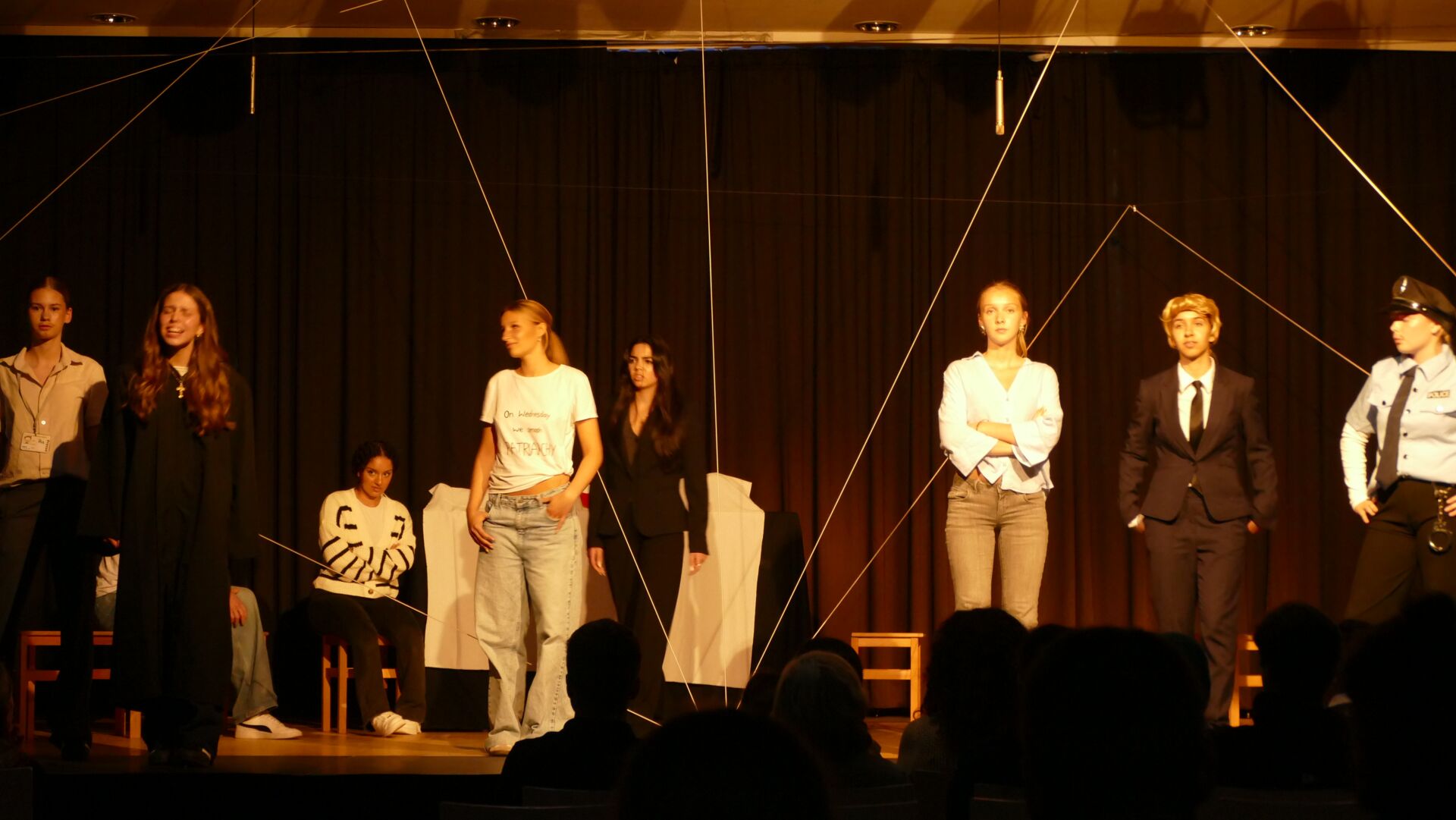 Der Kurs hat eine beeindruckende Inszenierung auf die Bühne gebracht. Die Schuldverstrickungen wurden ein über die gesamte Bühne gespanntes und verkreuztes Gummiband dargestellt und die Getötete war auf einer stilisierten, rollenden Leichenbahre permanent präsent.