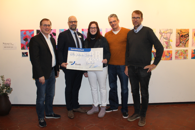 Den symbolischen Scheck übergab Herr Clausen von der BB Bank am 7.11.2019 an Frau Czysewski-Kindt, Herrn Evert vom Förderverein der KKS, an den Schulleiter, Herrn Schulz, und seinen Stellvertreter, Herrn Heyden.