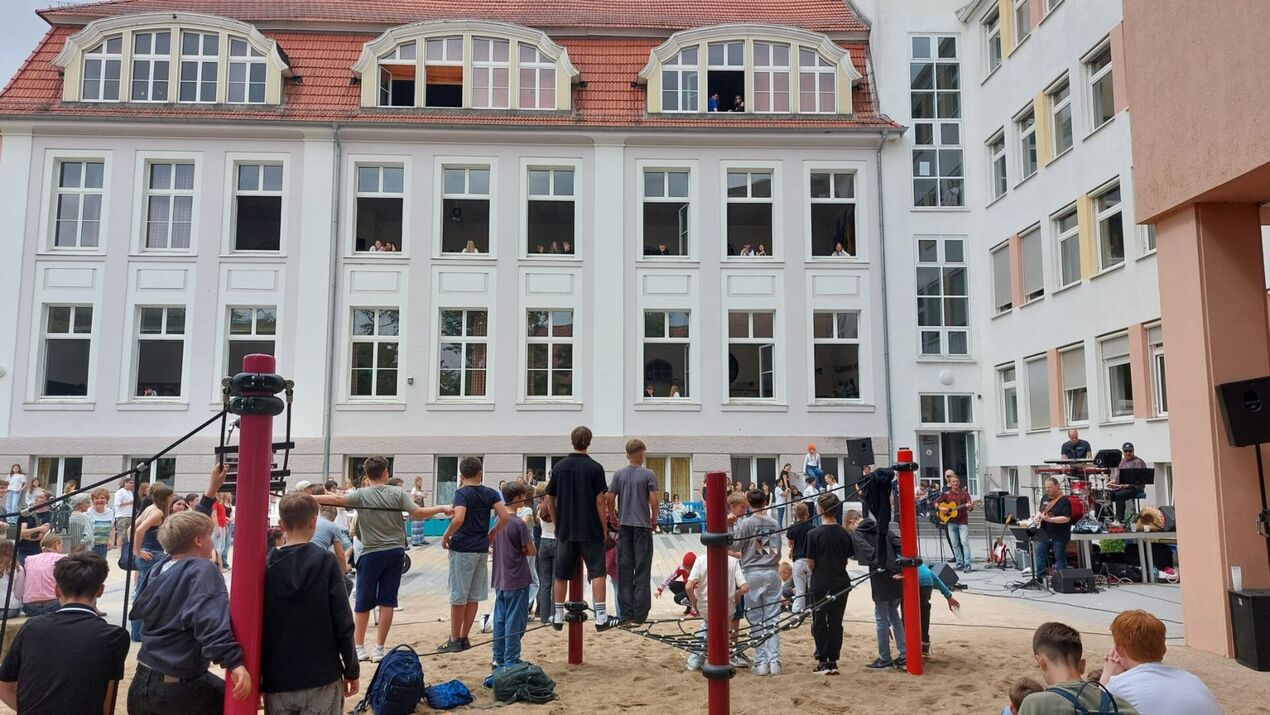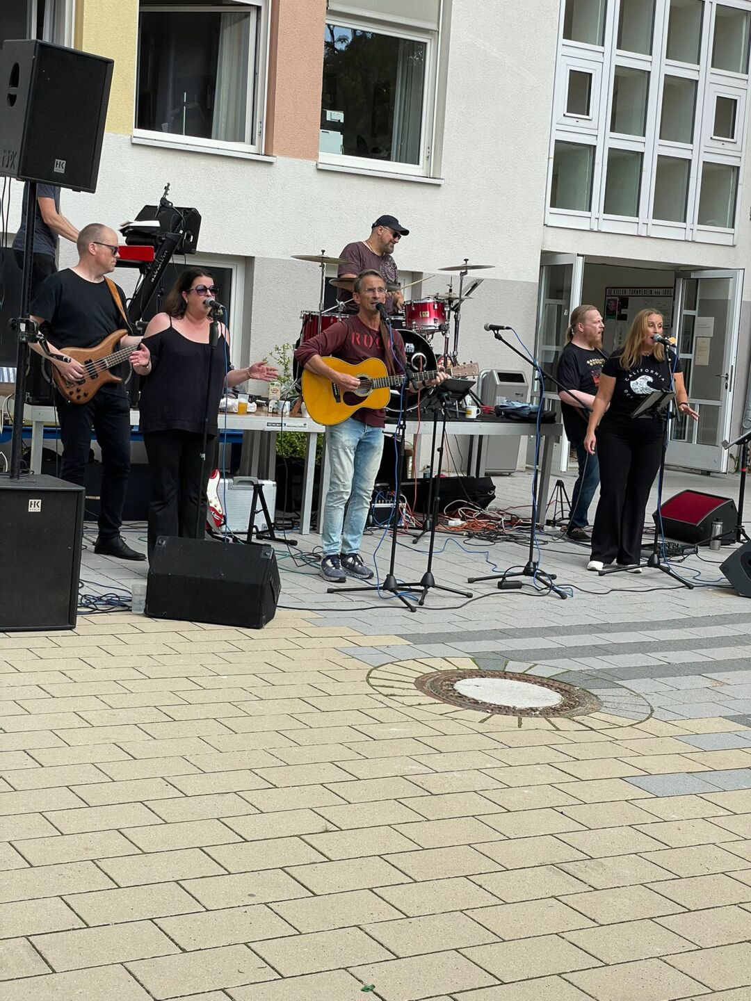 Siegbert Hübner hat sich zu seiner Verabschiedung in den Ruhestand etwas Besonderes überlegt. Er wollte allen Schüler*innen musikalisch Tschüss sagen und brachte dafür die alte Schulband aus ehemaligen Schülerinnen und Schülern wieder zusammen. Auf dem Schulhof bei sonnigem Wetter wurde 70 Minuten lang durchgerockt, mal laut, mal etwas leiser, aber immer mehrstimmig. Alle Schüler*innen wurden mit Freigetränken und Bretzel versorgt. Zu der Oldieband gesellte sich noch Emilia Rudolph dazu und senkte dadurch den Altersdurchschnitt beträchtlich. Mit allen Frauen wurde auch ein Duett gesungen und ein altes Bandmitglied von Hübi zupfte den Bass. Ein Schöner Abschied, der soundmäßig optimal abgemischt wurde von Ulli Ehlert. Dabei waren: Steffi und Boris Ehlers (der extra aus Glasgow gekommen ist) Inga Schmaser, Emilia Rudolph, Lars Schröder, Tim Strothmann und Florian Siegesmund.
