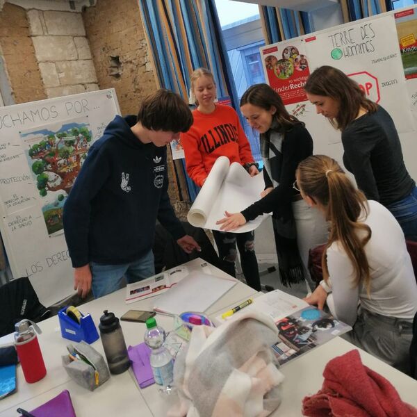 In vielen Ländern haben Kinder nicht annähernd die Rechte und Freiheiten, die wir in Deutschland genießen dürfen. Mit dieser Problematik haben wir uns im Spanischunterricht in der Einheit <<jóvenes>> auseinandergesetzt. Zusammen mit unserem Lehrer haben wir daraufhin beschlossen die Hilfsorganisation „Terre des Hommes" mit einer Spendenaktion zu unterstützen. „Terre des Hommes" beschäftigt sich mit Kinderrechten in aller Welt, indem sie sich beispielsweise gegen Kinderarbeit, Diskriminierung und Mangelernährung einsetzt. Damit wir möglichst viele Spenden sammeln, haben wir in unserer Schule in der Woche vor den Weihnachtsferien in den Pausen Waffeln, Plätzchen und Punsch verkauft, sowie zusätzliche Spendenboxen aufgestellt. Auch sind wir im Voraus durch alle Klassen gegangen, um unsere Mitschüler sowohl über unsere Aktion als auch über „Terre des Hommes“ zu informieren. Außerdem haben wir Infoplakate in der Schule aufgehangen und Flyer verteilt. Um zusätzlich das Bewusstsein für Nachhaltigkeit zu stärken, haben wir den Punsch vergünstigt angeboten, wenn die Schüler ihren eigenen Becher mitgebracht haben.